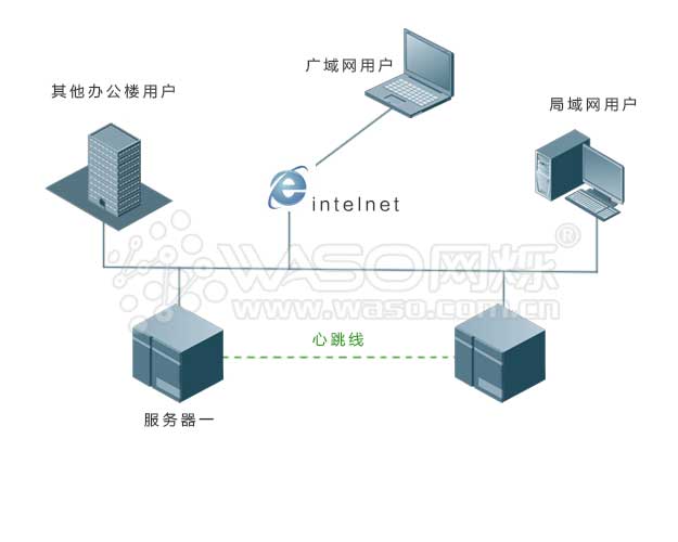 同時,服務(wù)器通過心跳線(目前往往采用建立私有網(wǎng)絡(luò)的方式)偵測另一臺服務(wù)器的工作狀況。當(dāng)一臺服務(wù)器出現(xiàn)故障時,另一臺服務(wù)器根據(jù)心跳偵測的情況做出判斷,并進(jìn)行切換,接管服務(wù)。對于用戶而言,這一過程是全自動的,在很短時間內(nèi)完成,從而對業(yè)務(wù)不會造成影響。由于使用共享的存儲設(shè)備,因此兩臺服務(wù)器使用的實際上是一樣的數(shù)據(jù),由雙機(jī)或集群軟件對其進(jìn)行管理。